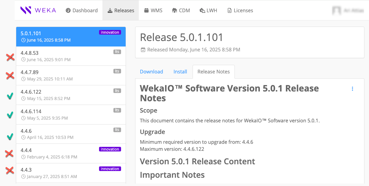 Each release in get.weka.io is tagged as either Innovation or LTS.