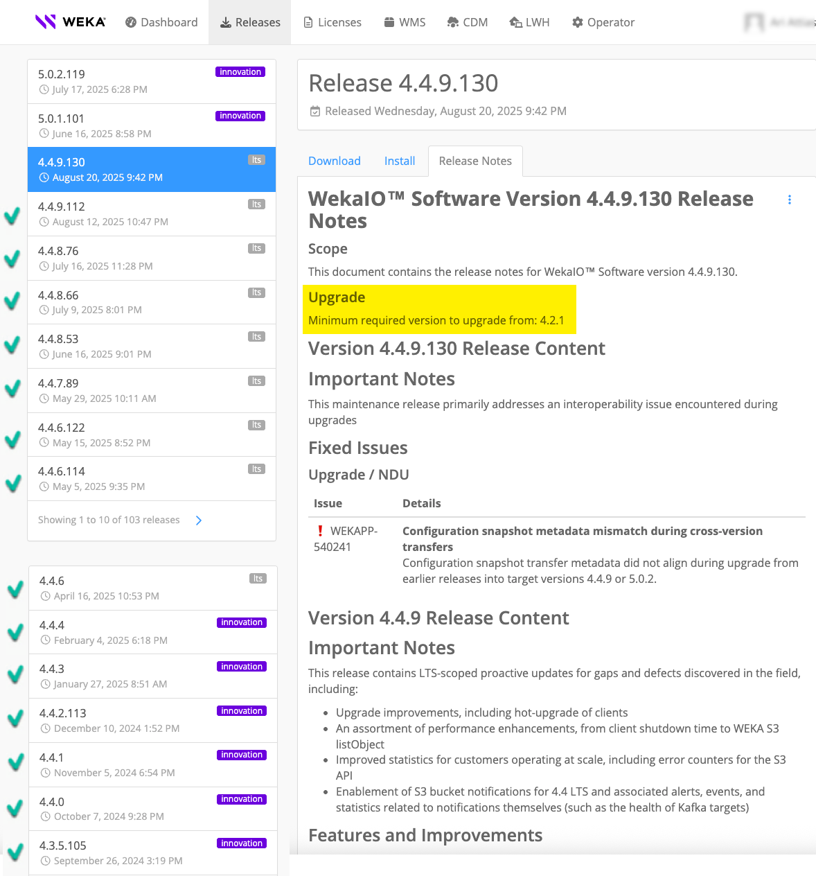 Reference information: For detailed source-to-target support per release, refer to the upgrade section at get.weka.io.