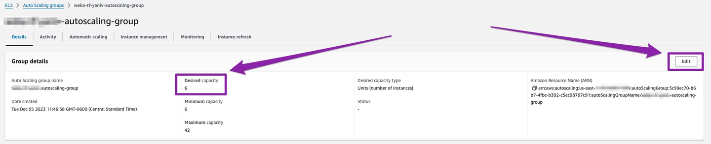 Scaling your WEKA cluster, whether scale-out (expanding) or scale-in (contracting), is streamlined using the AWS AutoScaling Group Policy set up by Terraform. This process leverages Terraform-created Lambda functions to manage automation tasks, ensuring that additional computing resources (new backend instances) are efficiently integrated or removed from the cluster as needed.