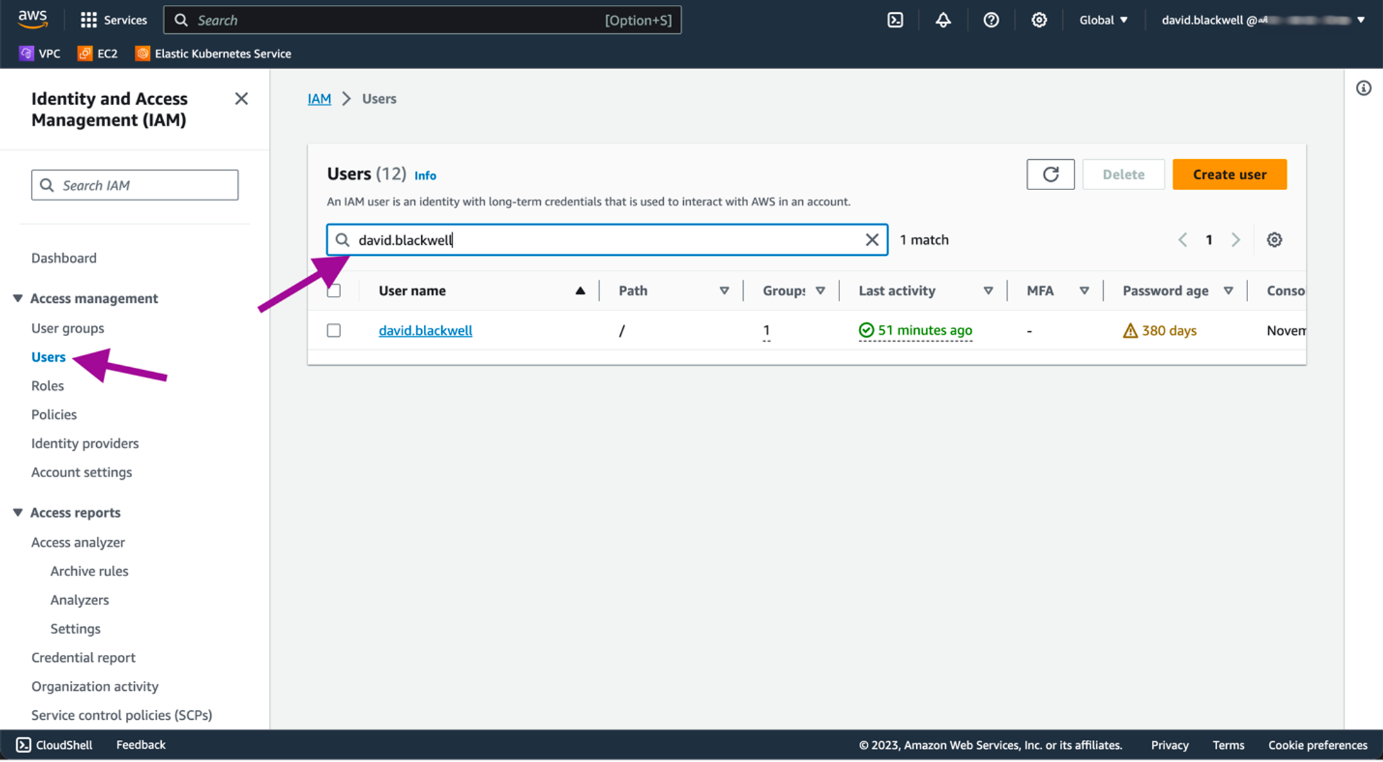 Locate the IAM user: Search for the IAM user or go to the Users section.