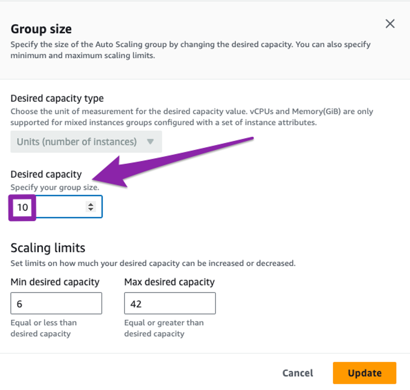 Select Update to save the updated settings to initiate scaling operations.