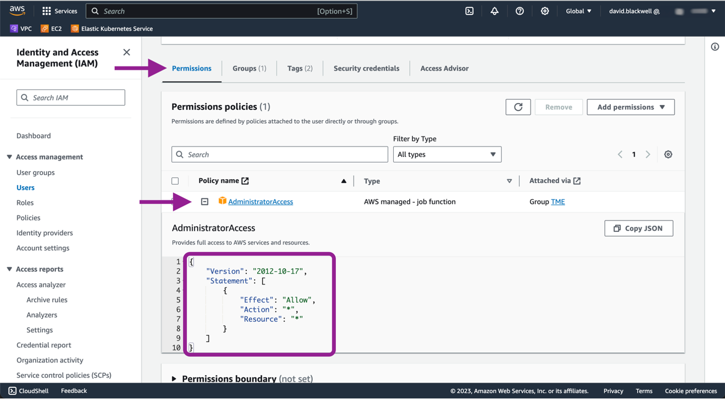 Verify permissions. Click on the user’s name to review their permissions. Ensure they have policies that grant the necessary permissions for managing AWS resources through Terraform.
