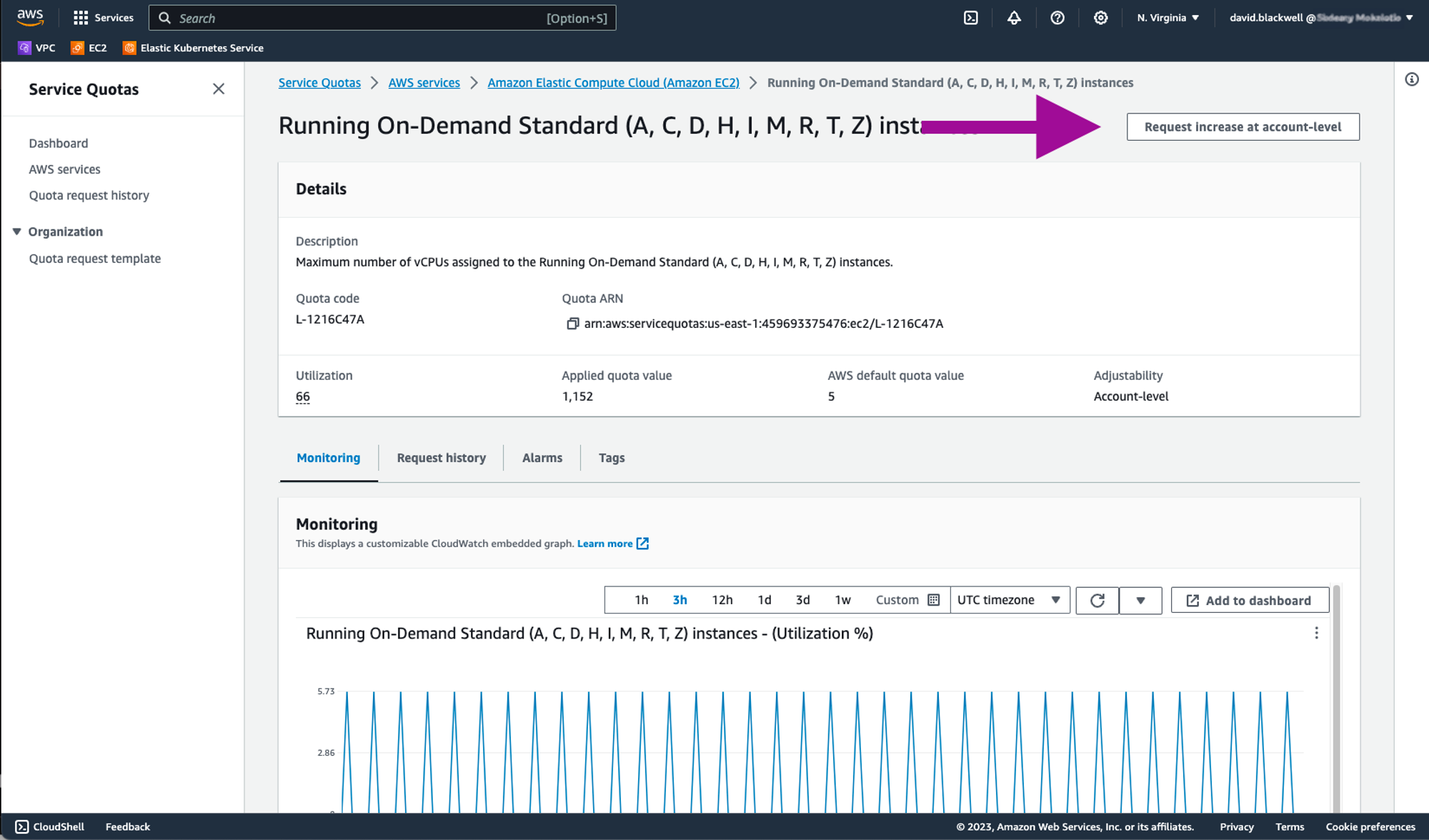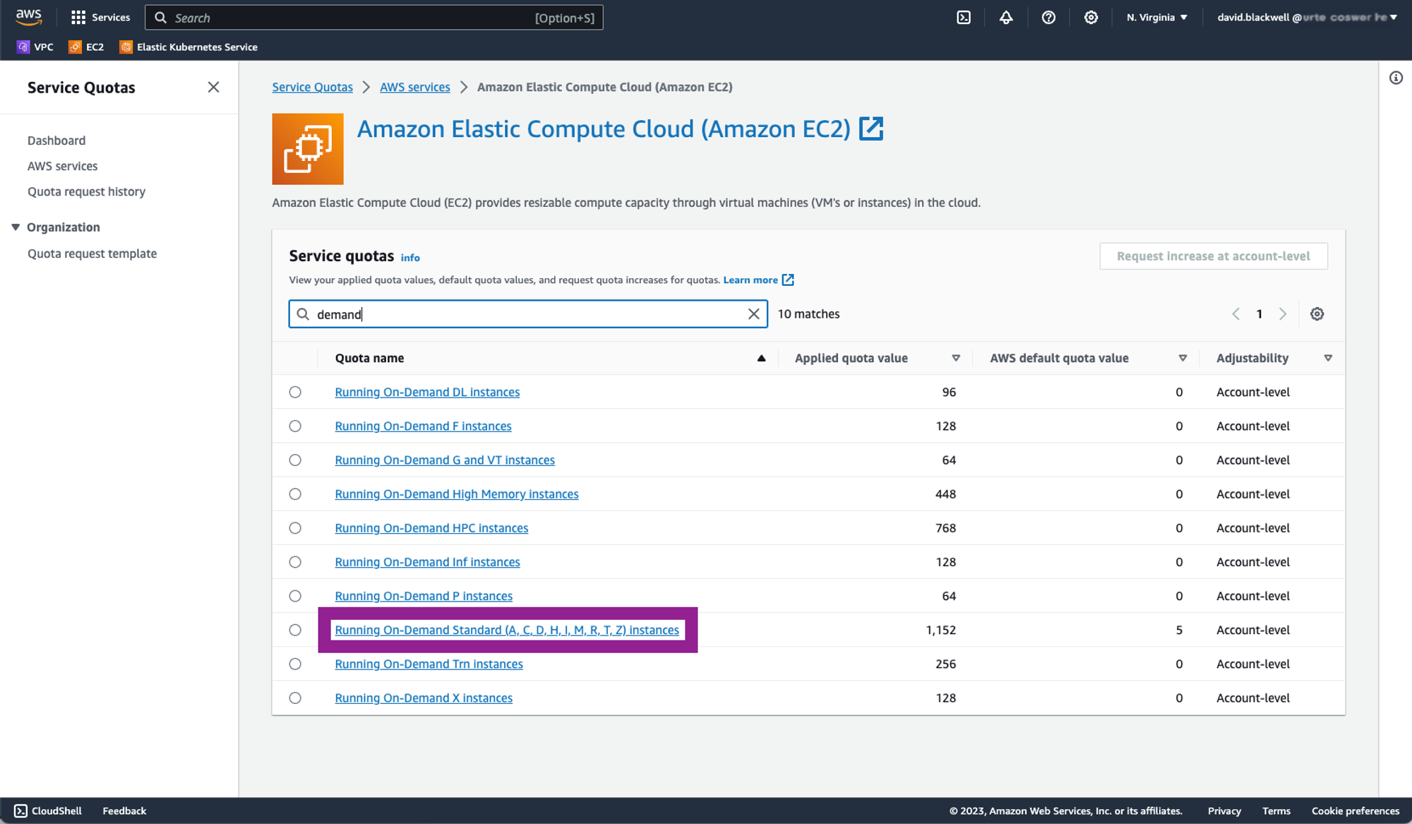 Request quota increase: Choose the relevant instance type from the Standard categories (A, C, D, H, I, M, R, T, Z), then click Request increase at account-level.