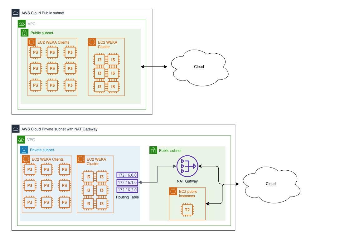 During the deployment of the WEKA system, the EC2 instances require access to the internet to download the WEKA software. For this reason, you need to deploy the WEKA system in one of the following deployment types in AWS: