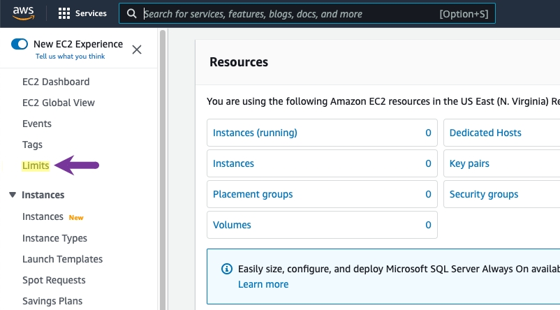 On the AWS EC2 dashboard, select the Limits option from the left menu.