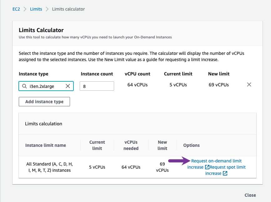 By default, AWS does not provide enough vCPUs to install a WEKA system. Use the Limits Calculator for your region from the AWS EC2 dashboard.