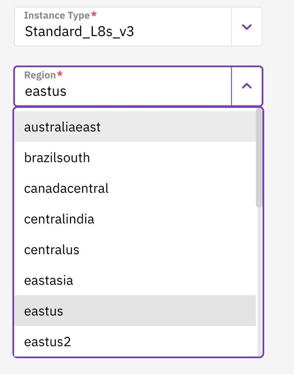 Certain fields within the configuration input panel require manual user input. Other fields, such as Instance Type, WEKA Version, and Region, are provided as selectable dropdown menus.