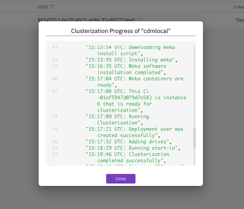 During the initial build of the WEKA cluster, various cloud services collect progress information. You can retrieve the clusterization progress from the Get Clusterization Progress menu option.