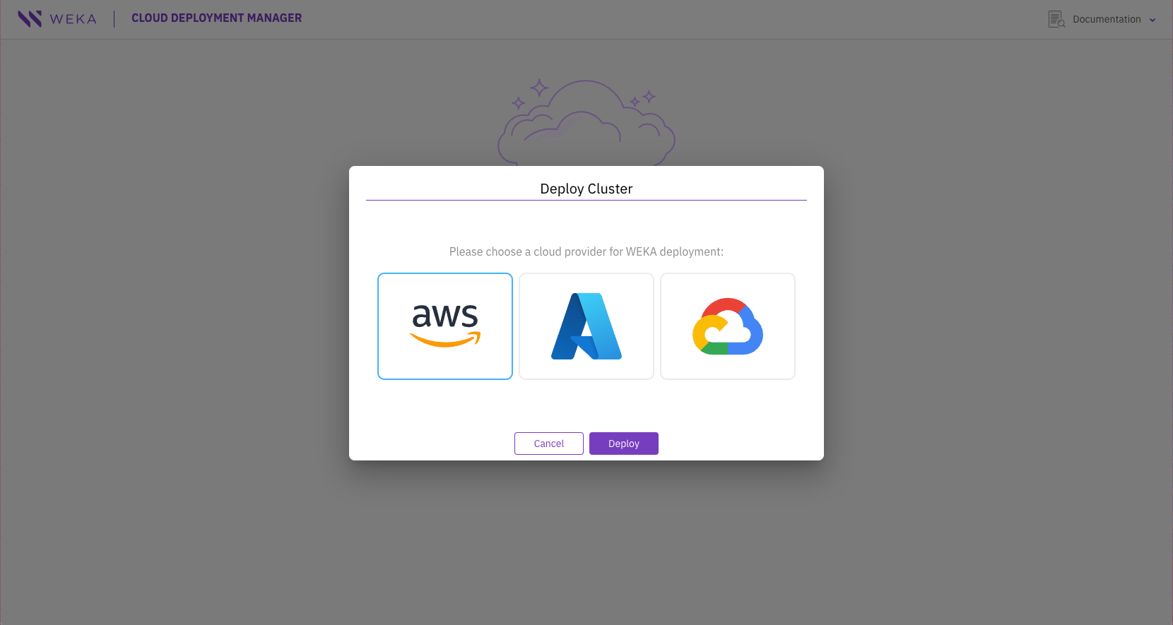 Deploy a Cluster: Click DEPLOY CLUSTER to start deploying your first WEKA cluster.