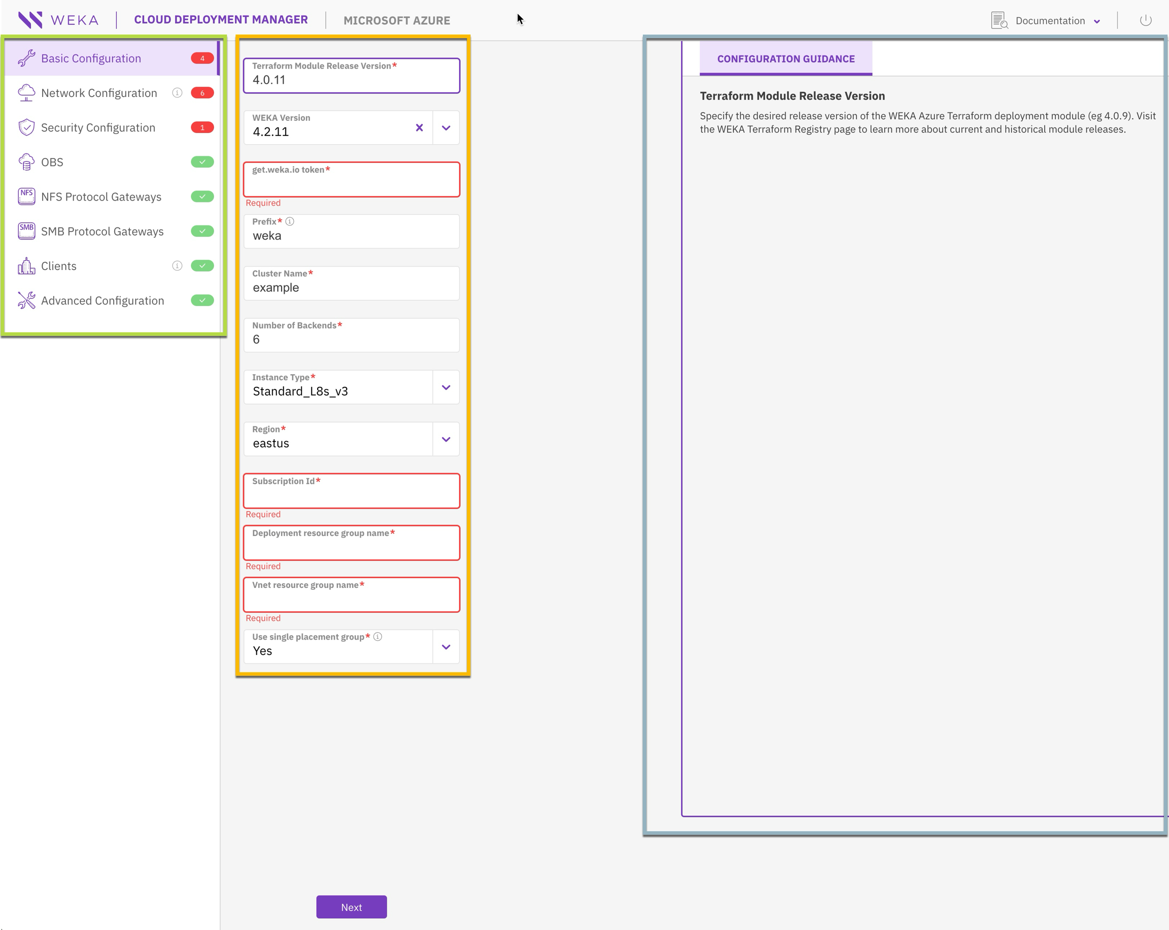 The configuration input panel enables customizing input fields related to the WEKA cluster deployment. These fields correspond to variables in WEKA Terraform modules, which traditionally require manual formatting and entry into a main.tf file. With CDM, these variables are presented visually, streamlining the configuration process.