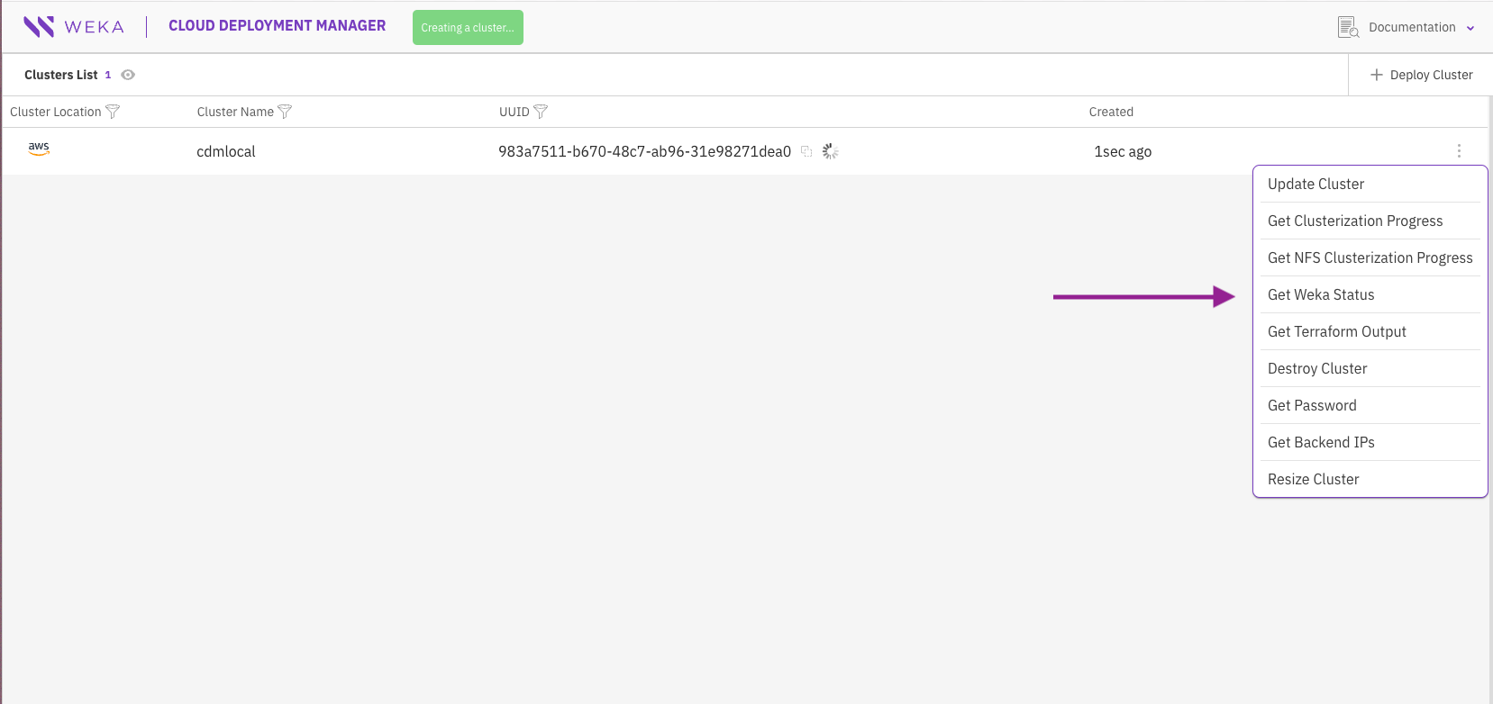 You can retrieve the status of the WEKA cluster at any time using the Get WEKA Status menu option.