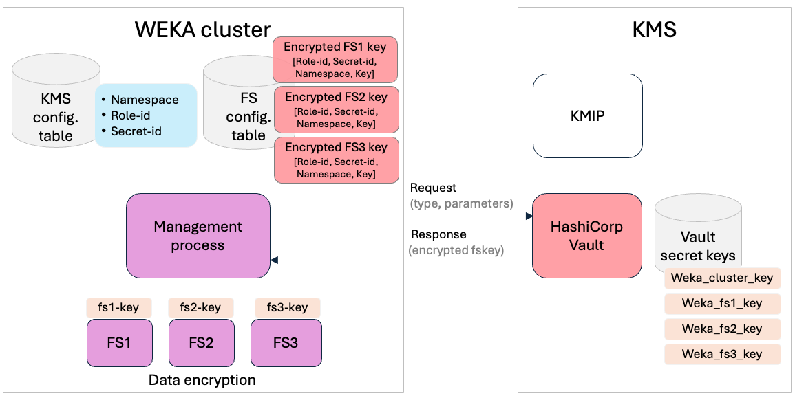 Before configuring per-filesystem encryption, you must first establish a connection between the WEKA cluster and the configured HashiCorp Vault KMS by setting up the `key-identifier` (Weka\_cluster\_key in the illustration above). Use the `weka security kms set` command to specify the `role-id` and `secret-id` for this connection. For details, see [#configure-the-kms](https://docs.weka.io/security/kms-management-1#configure-the-kms "mention").