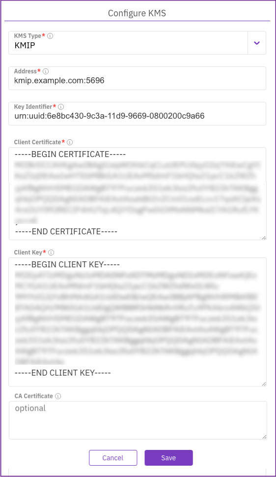 hostname:portformat. The hostname can be a fully qualified domain name (FQDN) or an IP address. Do not include protocol prefixes such ashttps://. The default port for KMIP is 5696, but this can vary based on the server configuration.KMS Identifier: The key UID used to secure the filesystem keys.