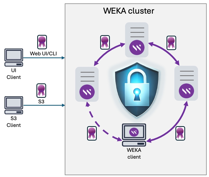 The TLS implementation in a WEKA cluster secures communication between clients and the system, and between WEKA servers and clients. TLS certificates serve two key purposes: