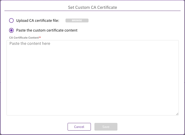 Select Paste the custom certificate content, and paste the content of the custom CA certificate.