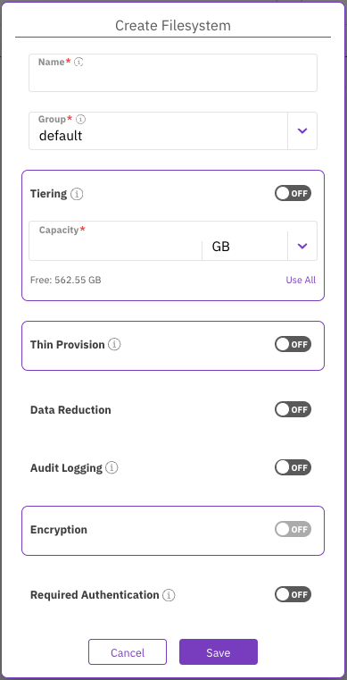 Optional: Required Authentication. When ON, user authentication is required when mounting to the filesystem. This option is only relevant to a filesystem created in the root organization. Enabling authentication is not allowed for a filesystem hosting NFS client permissions or SMB shares. To authenticate during mount, the user must run the