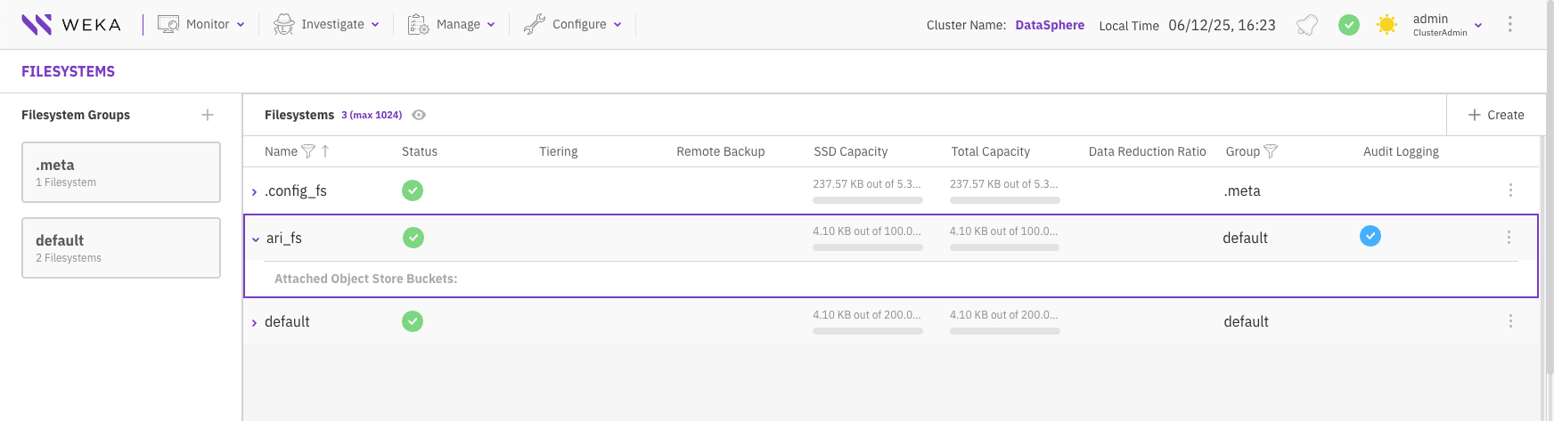 The filesystems are displayed on the Filesystems page. Each filesystem indicates the status, tiering, remote backup, encryption, SDD capacity, total capacity, filesystem group, and data reduction details.