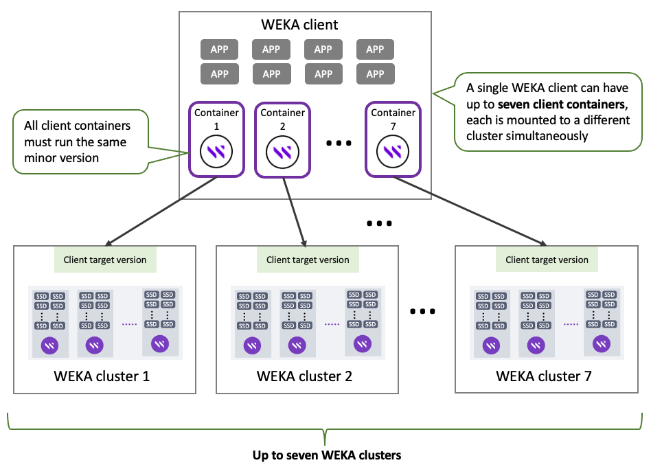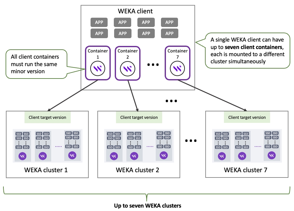 All client containers in the WEKA client must run the same minor version, at least version 4.2. The client version must be the same as the cluster or, at most, one version earlier.