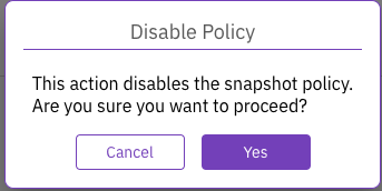 <div align="center" data-with-frame="true"><figure><img src="https://content.gitbook.com/content/ZW262oqYA8pNNfGvXjHa/blobs/DLit9npu9yPZLej4h1Ye/snap-policy-delete.png" alt="" width="375"><figcaption><p>Delete a snapshot policy</p></figcaption></figure></div>