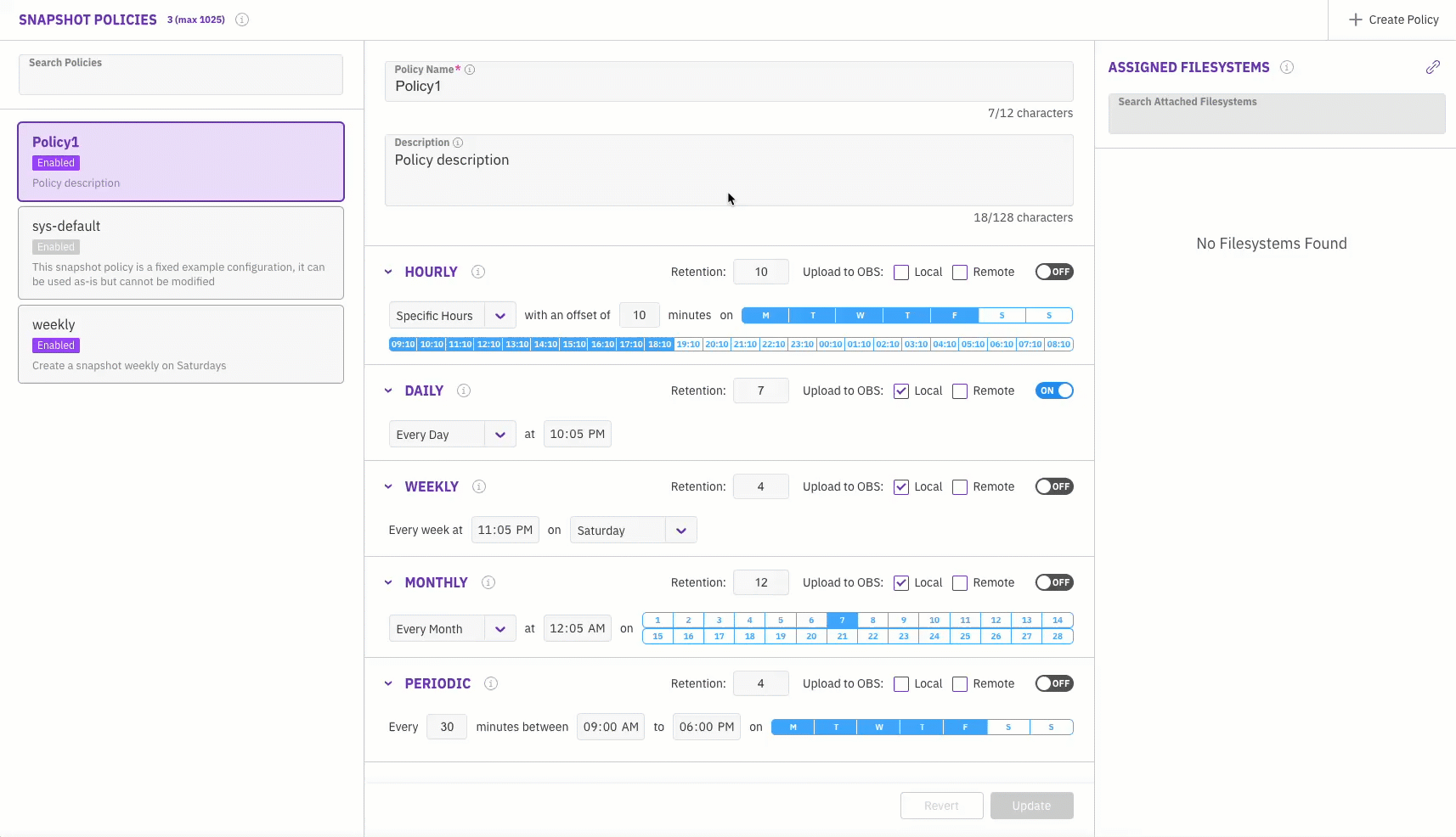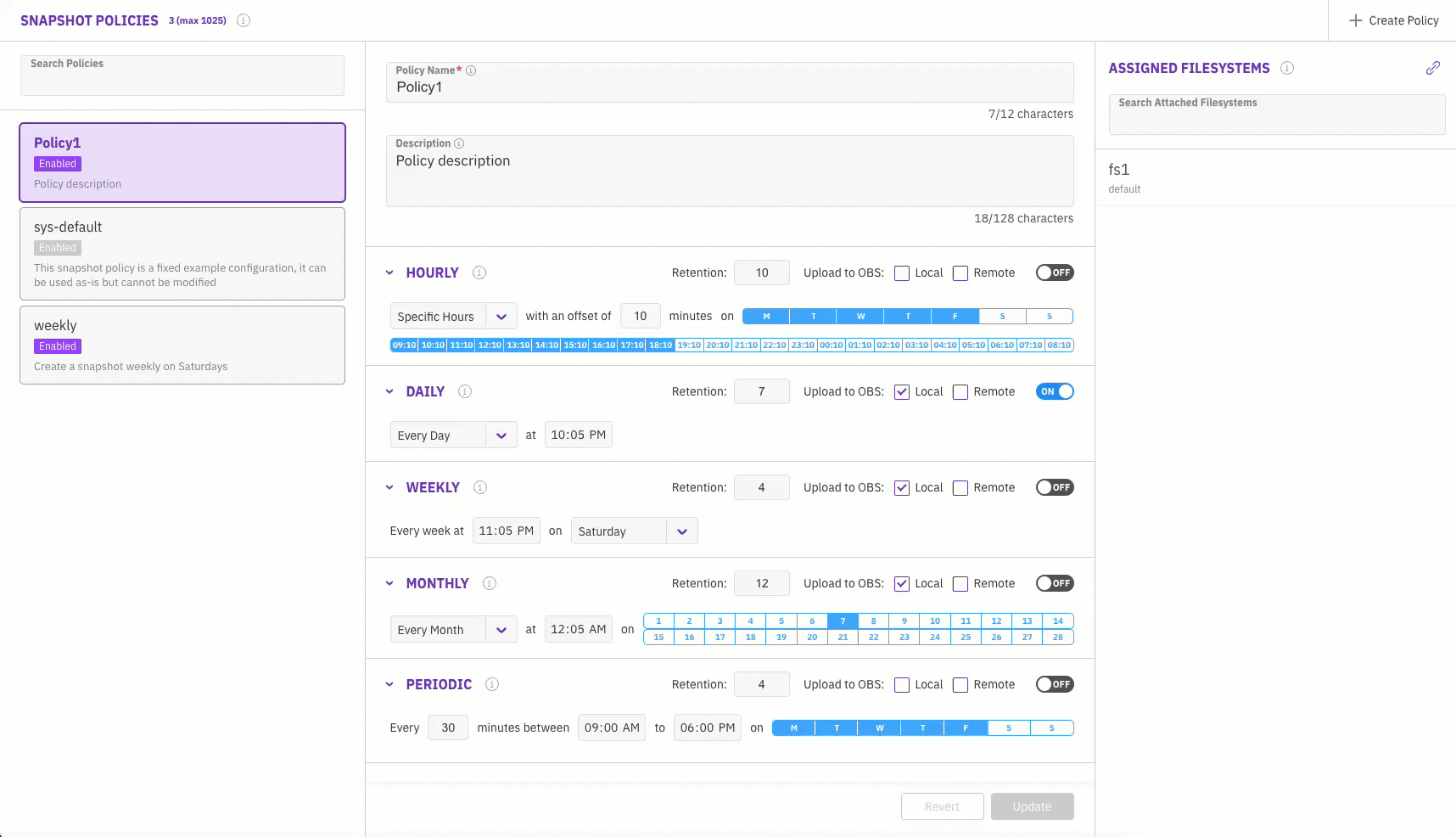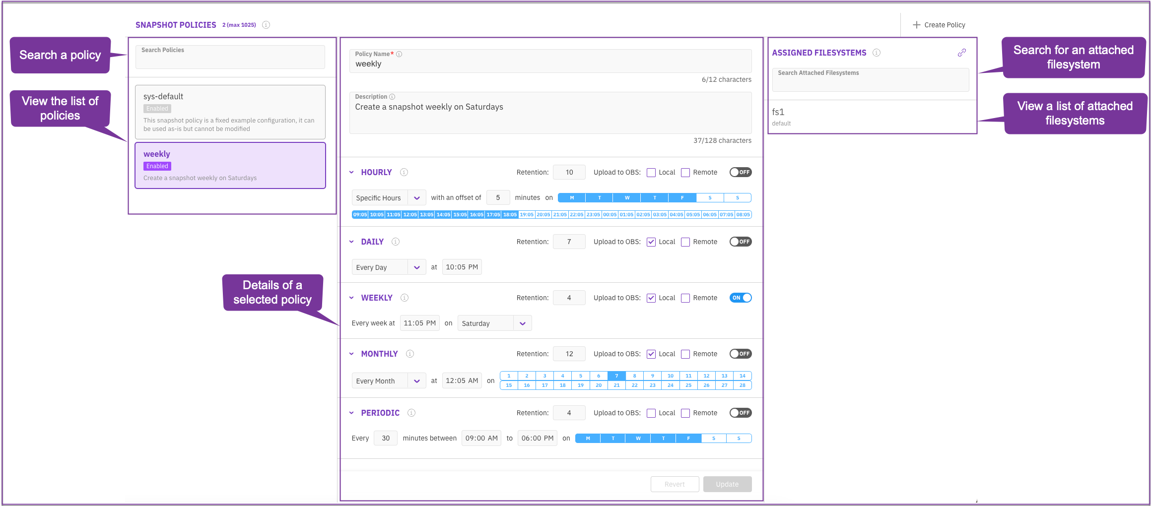 * **View a list of attached filesystems:** See all filesystems assigned with the selected snapshot policy.