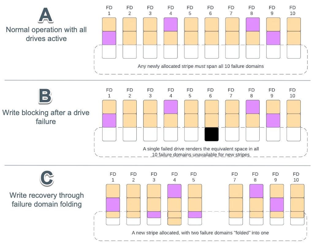Stage B: write blocking after a drive failure: When a single drive fails, any new stripe that must span all failure domains can no longer be allocated if any one domain lacks sufficient space due to the failure. Even though only one drive has failed, this strict allocation requirement can effectively block new writes. This results in a disproportionate loss of writable capacity relative to the actual size of the failure, particularly noticeable in systems with fewer drives per server.