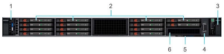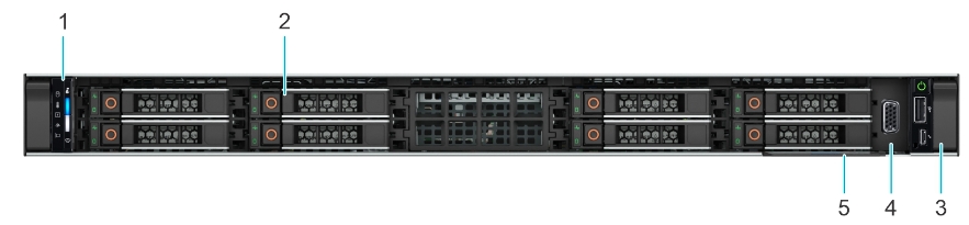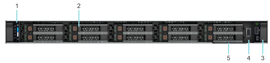 Contains the power button with integrated power LED, 1 x VGA port, 1 x 2.0 USB port, iDRAC Direct (Micro-AB USB) port, and the iDRAC Direct status LED.