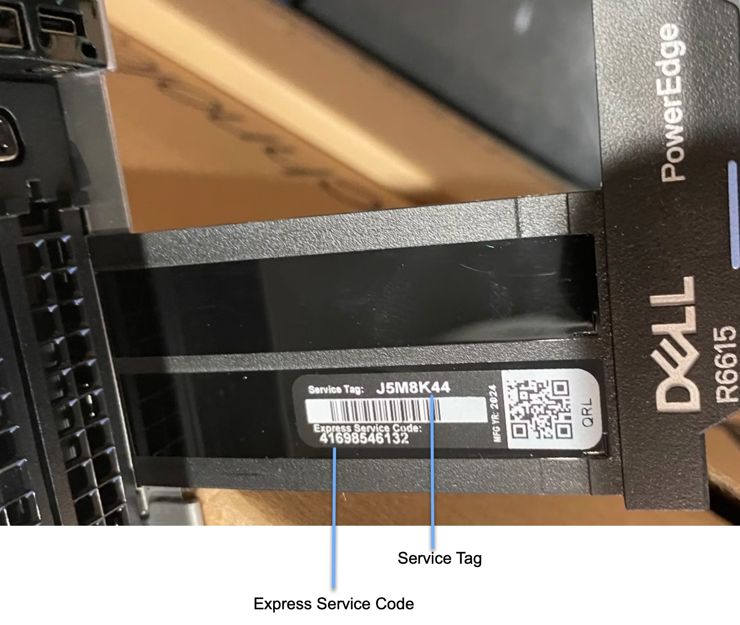 Each server can be identified by its unique Express Service Code and Service Tag. To access this information, pull out the Information tag located at the front of the server. Alternatively, this information may be found on a sticker on the chassis. The mini Enterprise Service Tag (EST) is located on the back of the server and is used to route support calls to the appropriate personnel.